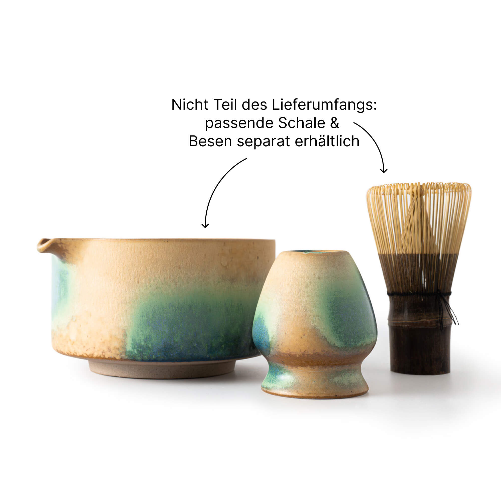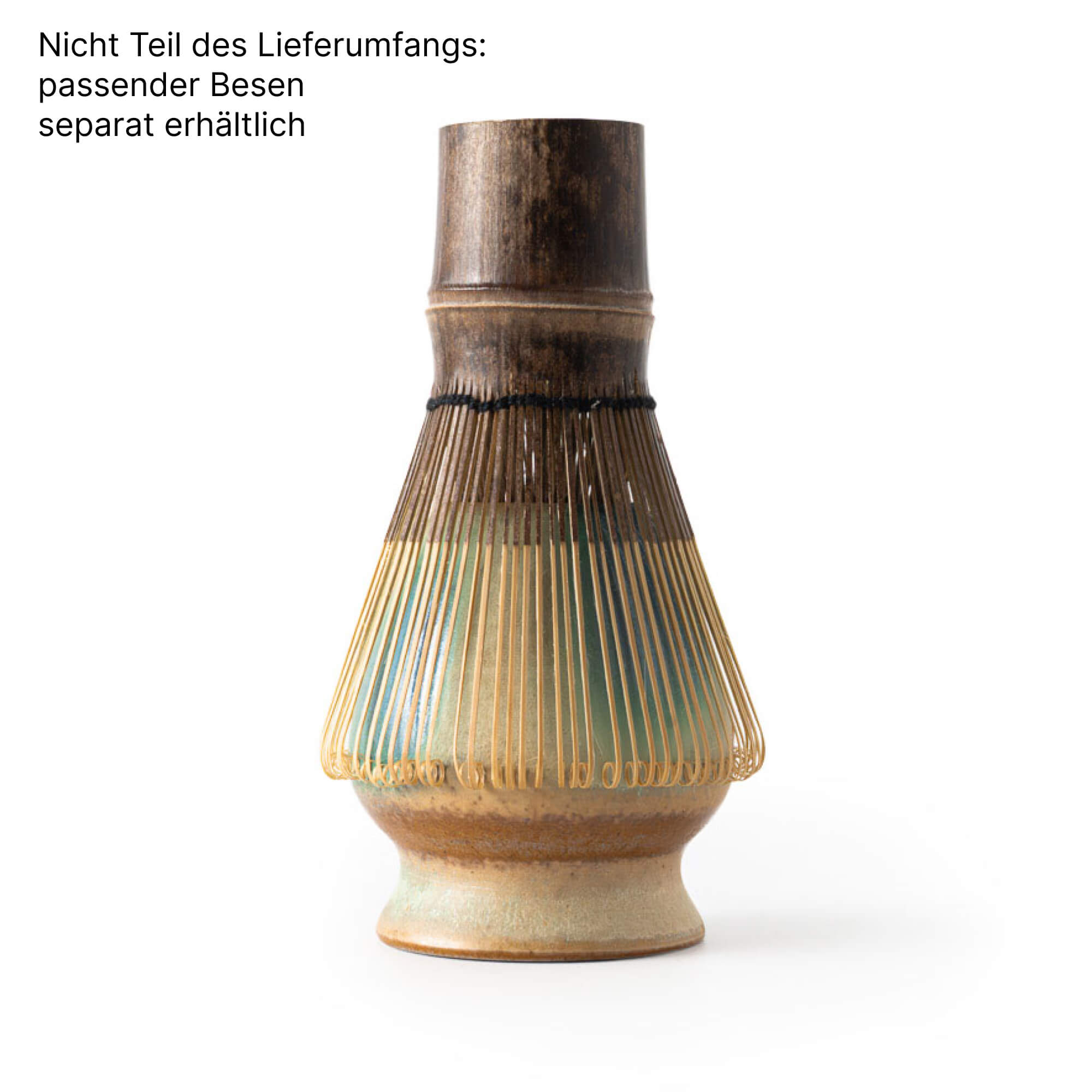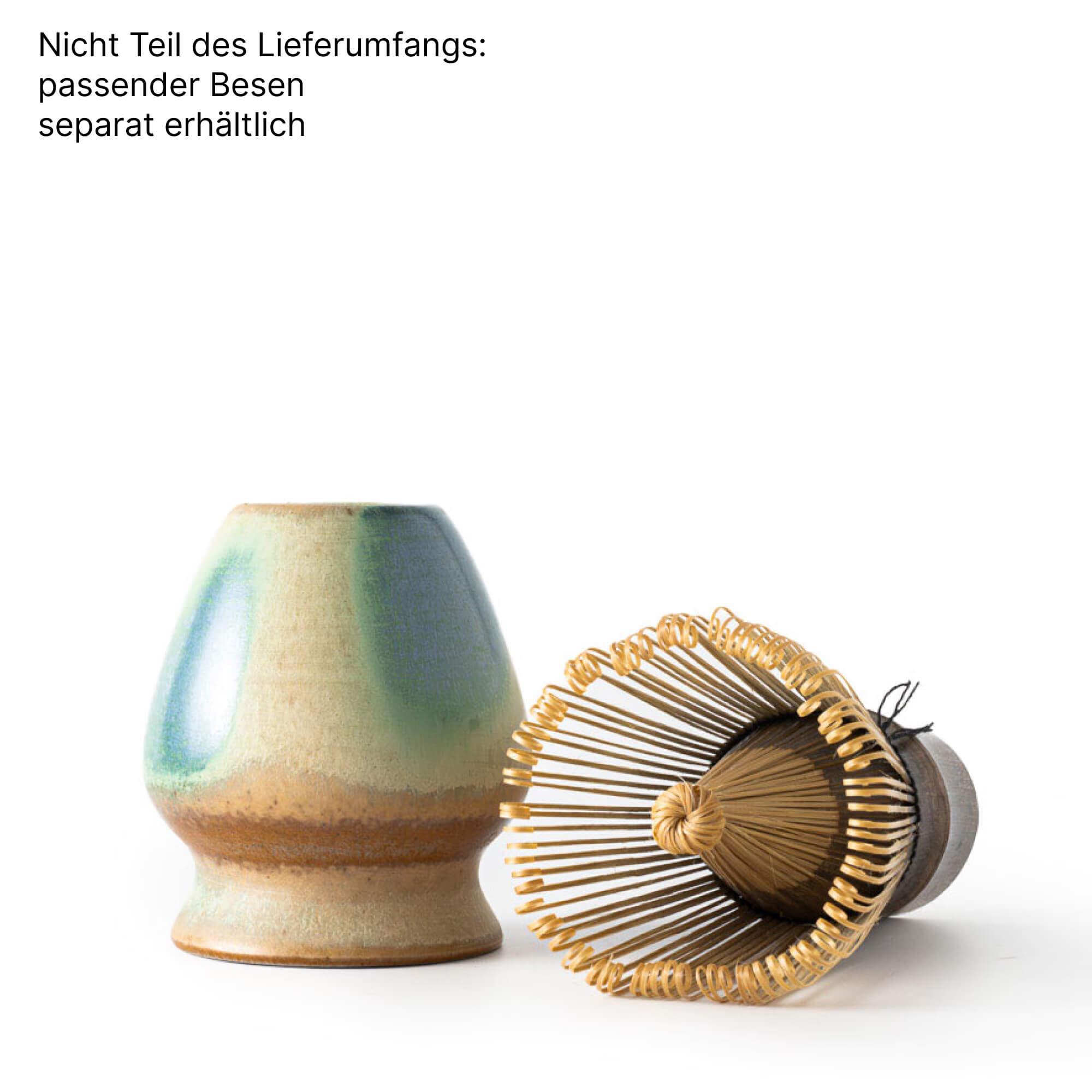 Warme Naturtöne treffen auf kühle Blau- und Grüntöne. Die Wirkung ist ruhig, klar und harmonisch. Der Besenhalter fügt sich visuell nahtlos zur Matcha Schale AURORA.