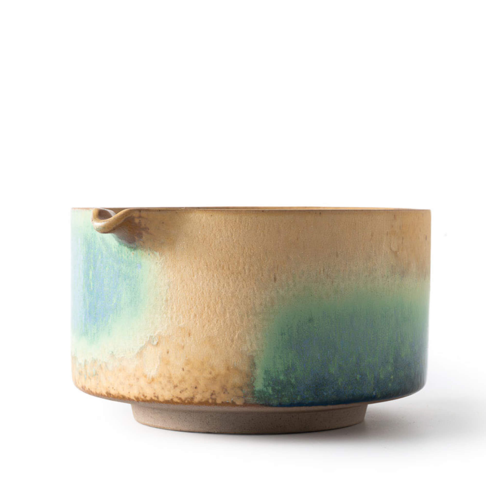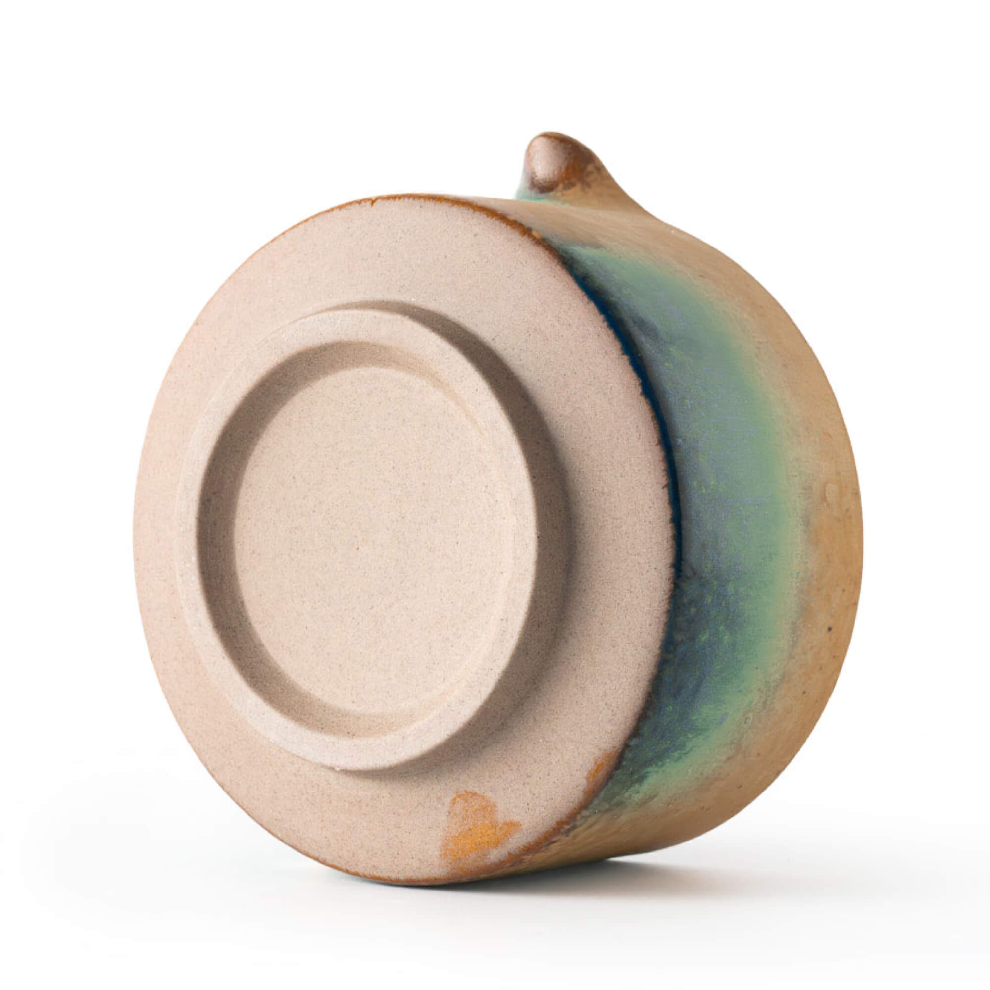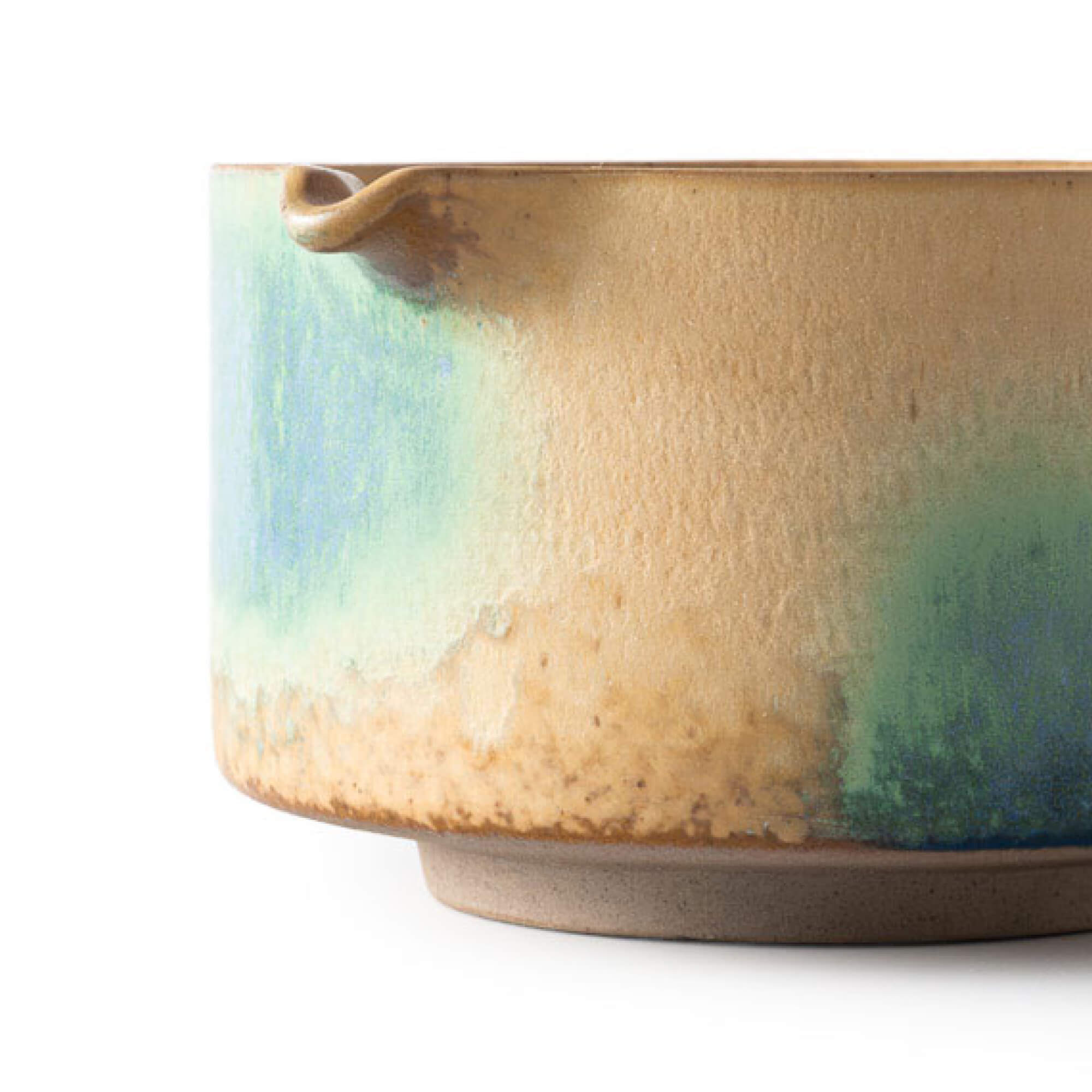 Die mehrschichtige Glasur zeigt einen weichen Verlauf von warmem Beige zu tiefem Grün und Blau. Wie bei Polarlichtern entstehen die Übergänge nicht scharf, sondern fließend und organisch. Die Oberfläche ist leicht strukturiert und seidenmatt, wodurch Tiefe und handwerklicher Charakter sichtbar bleiben. Jede Schale ist ein Unikat.