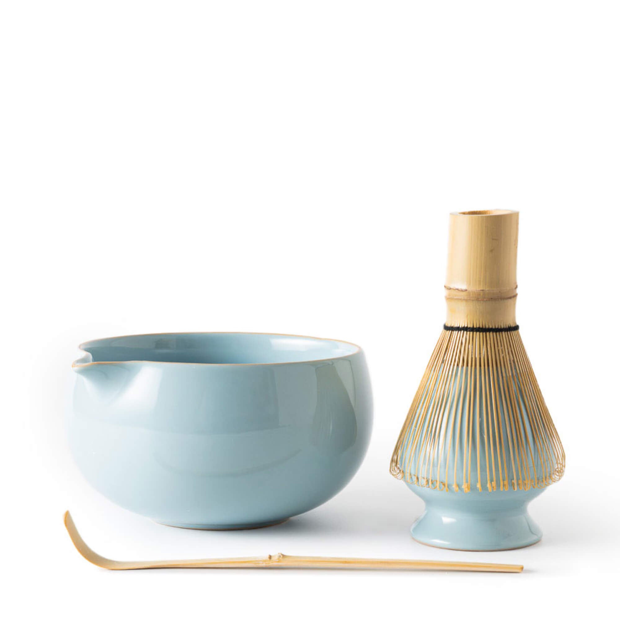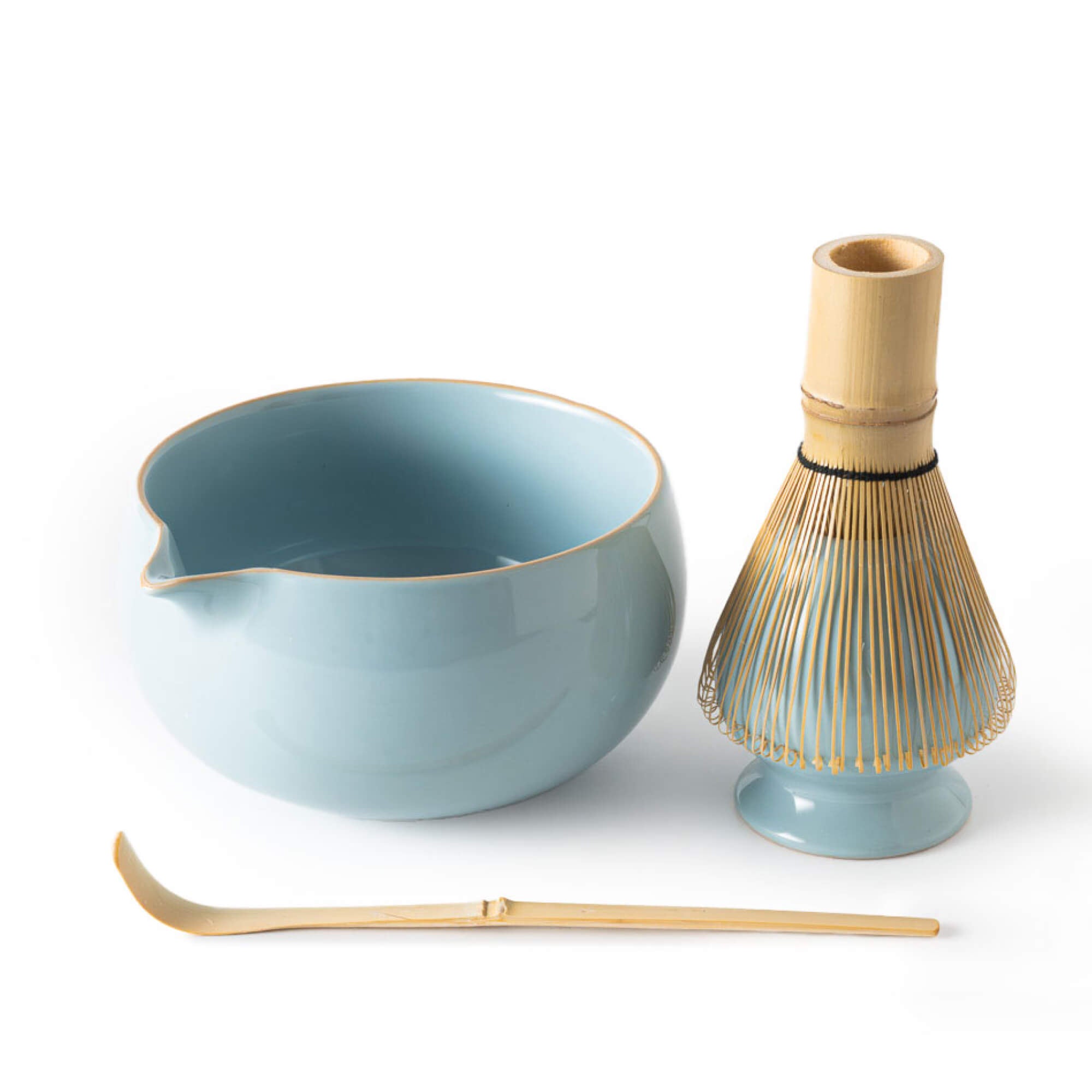 Matcha Set BLAU: Schale, Bambusbesen, Bambuslöffel & Keramik-Besenhalter